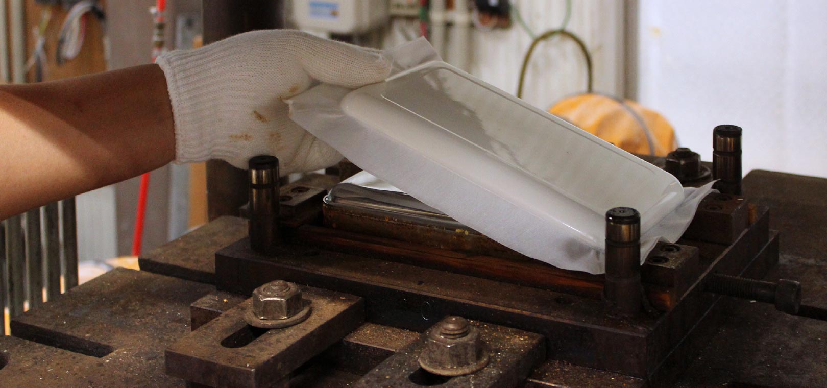 全国的でも数社しか持たない珍しい技術で、熱硬化性樹脂からなる基体と、布生地を不飽和ポリエステル樹脂で封止した化粧層を融合させる成型方法です。様々な色や模様の布地を加工するため、そのお客様だけのオンリーワン商品が出来上がります。また、思い出が詰まった布地などを再加工する事で、資源の再利用を推進します。
